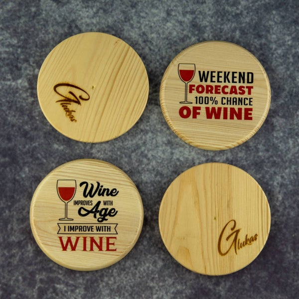 Set van 4 ronde houten onderzetters met een doorsnede van 10cm incl houder. Omdat ze van hout zijn is elke onderzetter uniek. Handgemaakt.