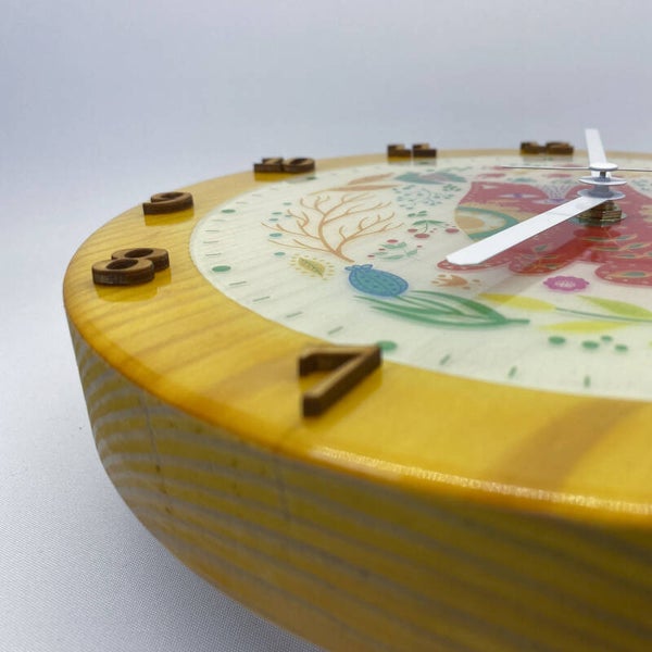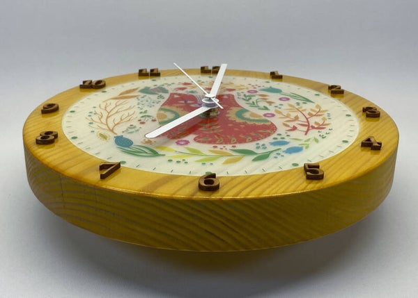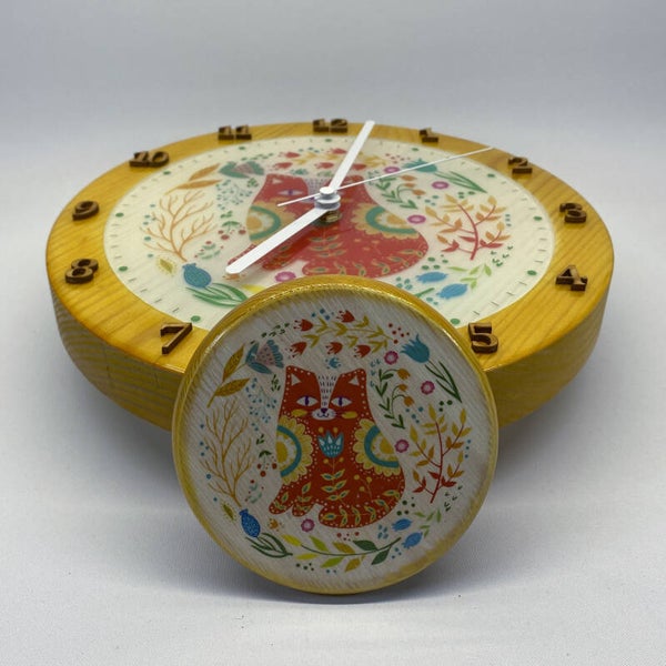 The clock is made of wood. It has a noiseless mechanism powered by AA battery. Diameter 25cm. 3cm thick. It is protected with a transparent water-based varnish. Clock face made of epoxy resin. Handmade. The set includes a wooden mug with a diameter of 10cm. Everything is packed in a wooden box.