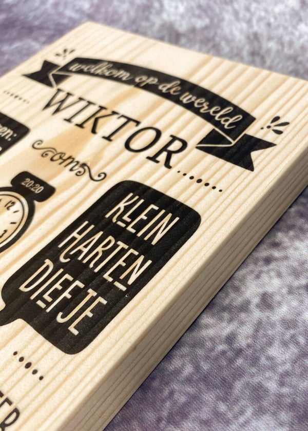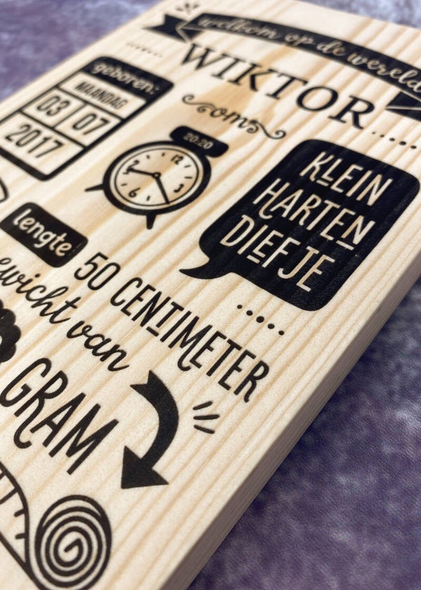 Het geboortebord is van hout gemaakt.Afmetingen: 21 x 14 x 1,6 cm.Geef bij bestelling de volgende informatie door: